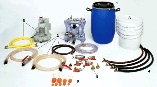 2. Membránové čerpadlo s odtlakovací hadicí, dvě plnicí hadice s uzavíracím zařízením, hadice kompresoru.